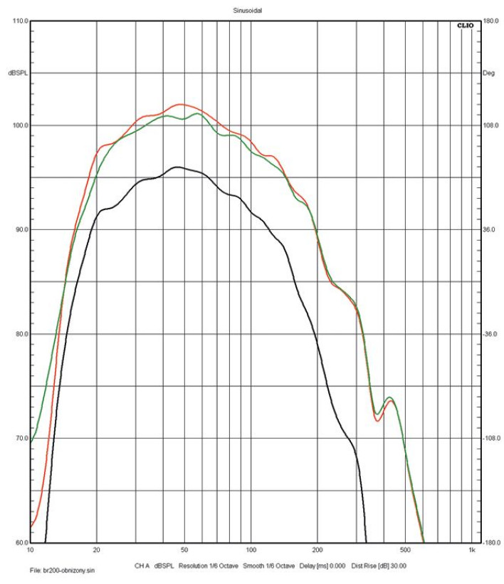 Charakterystyka czarna jest zaczerpnięta z rys. 1. – to bas-refleks we właściwym trybie, odcięcie 200 Hz, profil Music. Czerwoną uzyskamy, gdy w menu włączymy tryb obudowy zamkniętej, ale obudowy nie zamkniemy; wtedy wzmocnimy najniższe częstotliwości (poniżej 50 Hz) i dzięki temu przesuniemy też dolną częstotliwość graniczną z 19 do 17 Hz.