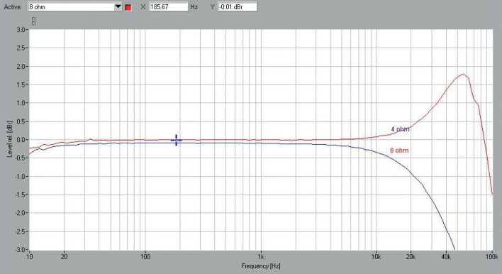 Typowe dla wielu konstrukcji impulsowych zjawiska widać też na charakterystykach częstotliwościowych (rys. 1). Interakcje fi ltrów wyjściowych z obciążeniami o różnej impedancji powodują niejednoznaczność charakterystyki w zakresie wysokotonowym. Dla 8 Ω powstaje szczyt (+1,8 dB) przy ok. 60 kHz, a w przypadku 4 Ω spadek -3 dB notujemy już przy 48 kHz; układ prawdopodobnie jest optymalizowany dla obciążenia 6 Ω.