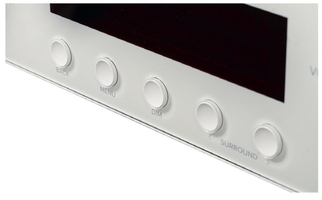Dwa pokrętła to klasycznie regulacja głośności i wybór źródeł. Przyciski umieszczone pod wyświetlaczem dają dostęp do menu i trybów dźwiękowych. Punktowa matryca ma niebieski odcień i jest wystarczająco czytelna.