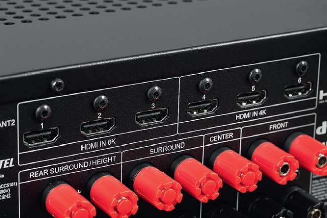 Wyposażenie w dekodery surround to solidny standard, obejmujący systemy Dolby Atmos oraz DTS:X – w praktyce niczego więcej nie trzeba. W tej dziedzinie widać wyraźną stabilizację. Siedem par terminali głośnikowych pozwala na różne konfiguracje.