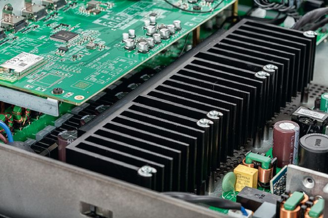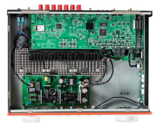 Relatywnie niewielkie (w porównaniu z konkurentami) gabaryty JBL MA710 wynikają przede wszystkim z zastosowania końcówek mocy w klasie D. Mimo że ich zalety nabierają znaczenia właśnie w amplitunerach wielokanałowych (mniejsze nagrzewanie, mniejsze problemy z impedancją obciążenia), są w takich urządzeniach wciąż rzadko stosowane. Impulsowy jest także zasilacz.