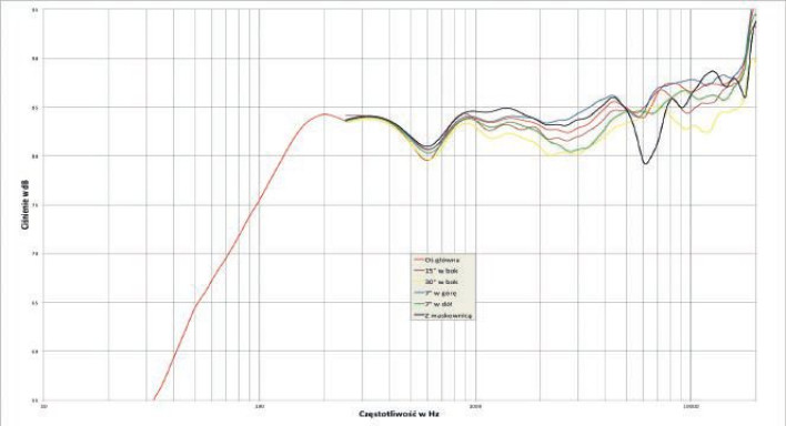 I o to pewnie chodziło - o przyniesienie ulgi głośnikowi, a nie o rozszerzanie pasma. Charakterystyka lekko wznosi się wraz ze wzrostem częstotliwości, w zakresie kilku kHz widać rozbieżności między krzywymi zmierzonymi na różnych osiach, co nie wygląda szczególnie niepokojąco, ale pozwala na delikatne "strojenie" - siadając nisko, wyciszymy ten zakres, przez co brzmienie stanie się mniej łagodne. Maskownica wprowadza jeden, ale wyraźny dołek - przy 6 kHz. Subwoofer oferuje bardzo szeroki zakres regulacji i niską dolną częstotliwość graniczną.