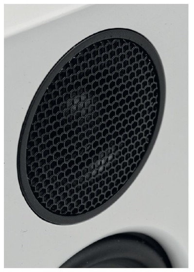 Odrobinę specyfiki wnosi siateczka na kopułce z diodą sygnalizującą pracę. Mimo to nie zabrało też klasycznej maskownicy zasłaniającej cały front. Tkaninę rozpięto na cieniutkiej ramce mocowanej magnetycznie do obudowy, co jest też korzystne akustycznie – w minimalnym stopniu wpływa na charakterystyki.