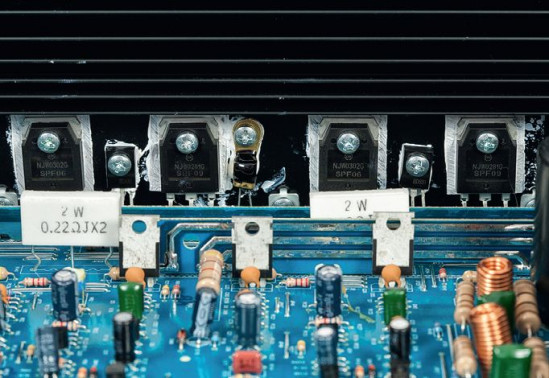 W dolnej części radiatora zainstalowano układy wyjściowe końcówek mocy, w każdym kanale dwa tranzystory ON Semiconductor. Cambridge Audio Topaz SR20 ma najbardziej okazały zasilacz, transformator toroidalny i niezależne odczepy dla różnych sekcji.