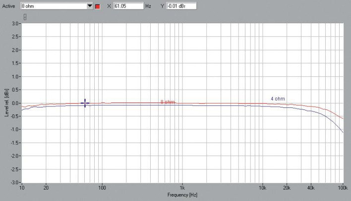 Charakterystyki przenoszenia (rys.1) są wyśmienite, spadek przy 10 Hz jest pomijalny, przy 100 kHz w zasadzie też, bo tylko -0,6 dB dla 8 omów i -1,2 dB dla 4 omów.