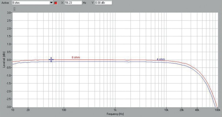 Odstęp sygnału od szumu to dobre 82 dB, dynamika sięga 103 dB – rezultaty są podobne jak w DRA-900H. Częstotliwościowe charakterystyki przenoszenia (rys. 1) też nie budzą zastrzeżeń, przy 10 Hz nie widać żadnego spadku, a na drugim skraju spadki -3 dB leżą przy 98 kHz przy obciążeniu 8-omowym i 88 kHz przy 4-omowym.
