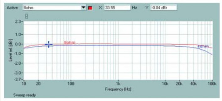 Poziom szumów jest niestety dość wysoki, S/ N wynosi więc tylko 73dB, w związku z czym dynamika nie chce być wyższa od 94dB. Pasmo przenoszenia (rys.1) jest świetne. Producent chwali się przedziałem 10Hz-70kHz z maksymalnym spadkiem -3dB, ale są to deklaracje mocno niedoszacowane. Absolutnie perfekcyjnie przedstawia się charakterystyka dla 8 omów, 10Hz przy -0.4dB i 100kHz na tym samym poziomie. Przy 4 omach dla 100kHz mamy wciąż dobre -1.1dB.