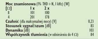 Zmierzone przez nas parametry okazały się niemal idealnie zbieżne z deklaracjami producenta. Rotel obiecał 100 W przy 8 omach, a mierzony egzemplarz RCX-1500 ma dokładnie 101 W w trybie mono i równiusieńkie 2 x 100 W w trybie stereofonicznym. Chociaż nigdzie w specyfi kacji nie odnalazłem danych przy 4 omach, to na takie obciążenia jest pozwolenie. Co więcej, okazuje się, że Rotel RCX-1500 w takich warunkach podwaja moc wyjściową przy wysterowaniu jednego kanału (201 W), w stereo mamy 2 x 178 W - daje więc o sobie znać limit zasilacza, ale i tak jest bardzo dobrze. Poziom szumów jest dla urządzeń w klasie D testem zawsze niewygodnym, bowiem na wynik wpływa szum wysokoczęstotliwościowy, który w praktyce jest niesłyszalny. Wynik -83 dB jest dla takiej technologii naprawdę dobry, dynamika sięga 103 dB.