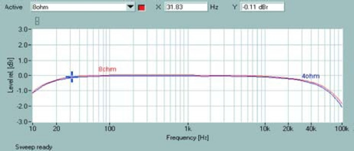 Czułość jest dość niska, wynosi 0.57V, co jednak nie powinno być przeszkodą, na pokładzie mamy już przecież wbudowany odtwarzacz CD, z zewnętrznymi źródłami poradzimy sobie podkręcając mocniej gałkę głośności. Poziom S/N to 84dB, a z uwagi na niewielką moc wyjściową dynamika wynosi równe 100dB. Pasmo przenoszenia (rys.1) ujawnia spadki na skrajach zakresu, ale nie na tyle duże, aby się nimi przejmować. Przy 10Hz poziom wynosi -1.2dB, a przy 100kHz -2dB.