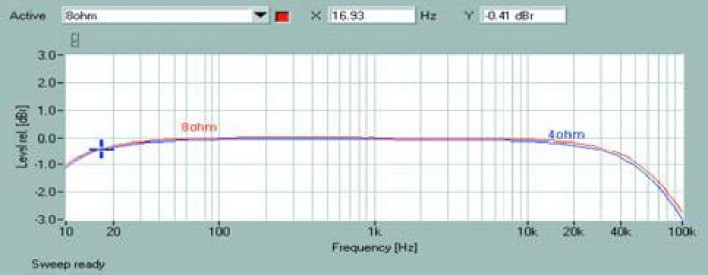 Enigma nie miała problemów z obsługą obciążenia 4-omowego. W przypadku 8 omów moc wyjściowa wynosi 53 W (i nie zmienia się przy podłączeniu dwóch kanałów), przy 4 omach Audio Analogue "produkuje" 2x71 W. Czułość na wejściu liniowym to standardowe 0,2 V. Biorąc pod uwagę fakt, iż elementem toru sygnałowego jest lampa, poziom szumów przedstawia się naprawdę nieźle - 86 dB, a dynamika przekracza 100 dB. Spadki na skrajach badanego pasma przenoszenia (rys. 1) to tylko -1 dB przy 10 Hz i -3 dB przy 100 kHz.