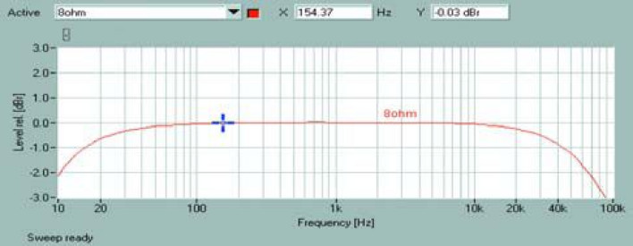 Pasmo przenoszenia (rys. 1) utrzymuje się w tolerancji -3 dB niemal w całym badanym zakresie, przy 10 Hz poziom wynosi -2,1 dB, a wysokie 90 kHz wyznacza właśnie -3 dB.