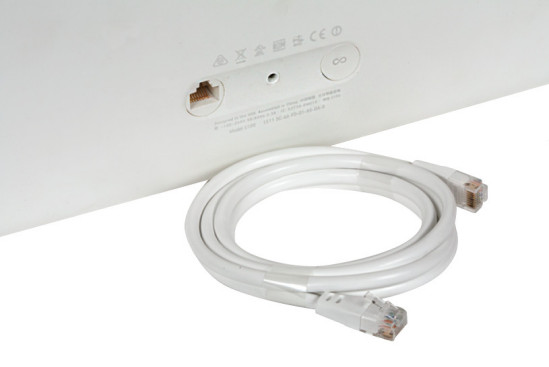 Play:5 Gen2 można podłączyć LAN-em, ale producent poleca WLAN. Nawet tutaj widoczna jest dbałość o image marki - dostarczono biały patch cord. Na tylnym panelu jest także przycisk pomagający "zameldować" urządzenie w sieci oraz wejście audio mini-jack.