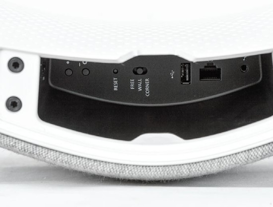 Przyciski służą do resetowania, parowania ze źródłami (w trybie Bluetooth) oraz wyłączania; nietypowy i pożyteczny jest hebelek zmieniający charakterystykę brzmienia i dostosowujący ją do sposobu ustawienia B&O Play A6 - na środku pomieszczenia, przy ścianie lub w narożniku.