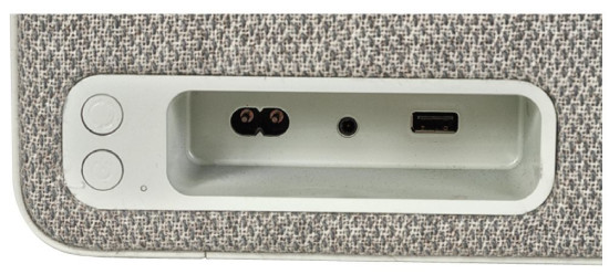 Maleńka wnęka zawiera gniazdo zasilające, USB i wejście mini-jack. USB służy do ładowania urządzeń mobilnych, ale komunikuje się wszechstronnie z urządzeniami iOS. Pojedyncze wejście audio (mini-jack) pracuje jak zwykłe podłączenie analogowe oraz cyfrowe światłowodowe.