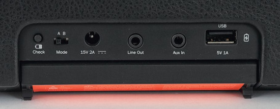 Pod zestawem przyłączy znajduje się klapka, otwarcie której stabilizuje głośnik. Wśród gniazd jest wyjście analogowe audio.