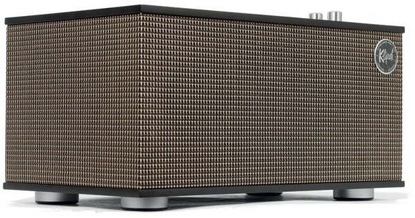 Obudowa Klipsch The Three II jest kanciasta, z elementami drewnianymi (w testowanej wersji polakierowanymi na czarno, dostępnymi też w bardziej klasycznej, naturalnej wersji orzechowej), maskownica z grubego, plecionego dwoma kolorami materiału, a na górze zobaczymy srebrną płytkę z hebelkowym włącznikiem zasilania i parą pokręteł (regulacja głośności i wybór źródeł – jak w normalnym wzmacniaczu); te elementy są metalowe, duża frajda.