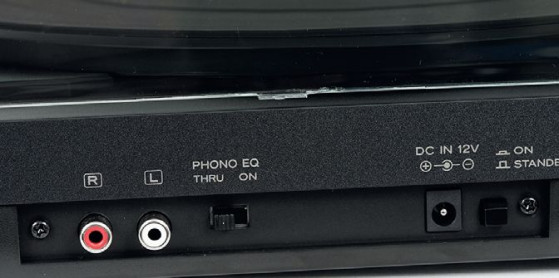 Tylny panel przypomina niektóre z droższych modeli gramofonów Teaca, oprócz wyjść RCA jest włącznik wbudowanego przedwzmacniacza phono.