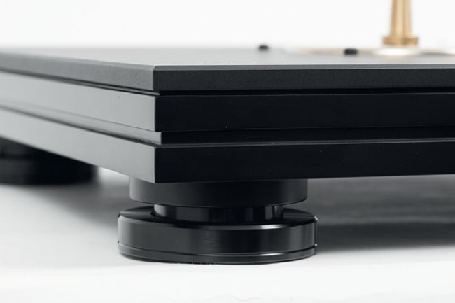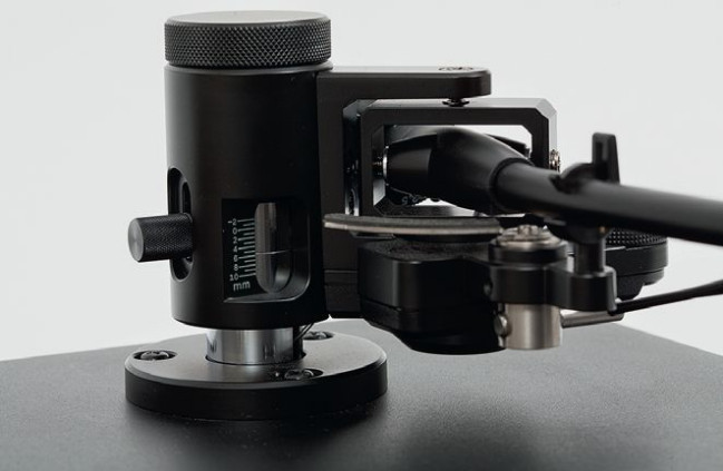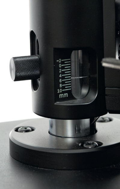 Wysokość zmieniamy górną nakrętką po wcześniejszym poluzowaniu bocznej śruby blokującej mechanizm. W dolnej części korpusu wycięto okienko ze wskaźnikiem położenia kolumny, aby można było łatwo okiełznać regulację, porównując efekty brzmieniowe różnych konfiguracji. Takie rozwiązania są na ogół spotykane w znacznie droższych gramofonach.