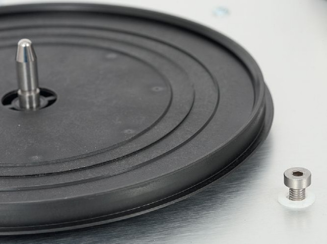Zewnętrzna część obudowy, wykonana z MDF-u, to tylko baza, wszystkie kluczowe elementy mocowane są do górnej aluminiowej płyty. Elementy napędu paskowego zmieściły się pod aluminiowym talerzem, który został wytłumiony krążkiem doklejonym do wewnętrznej strony.