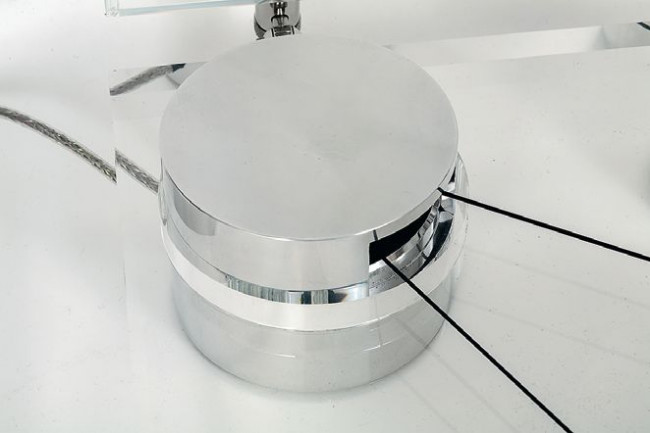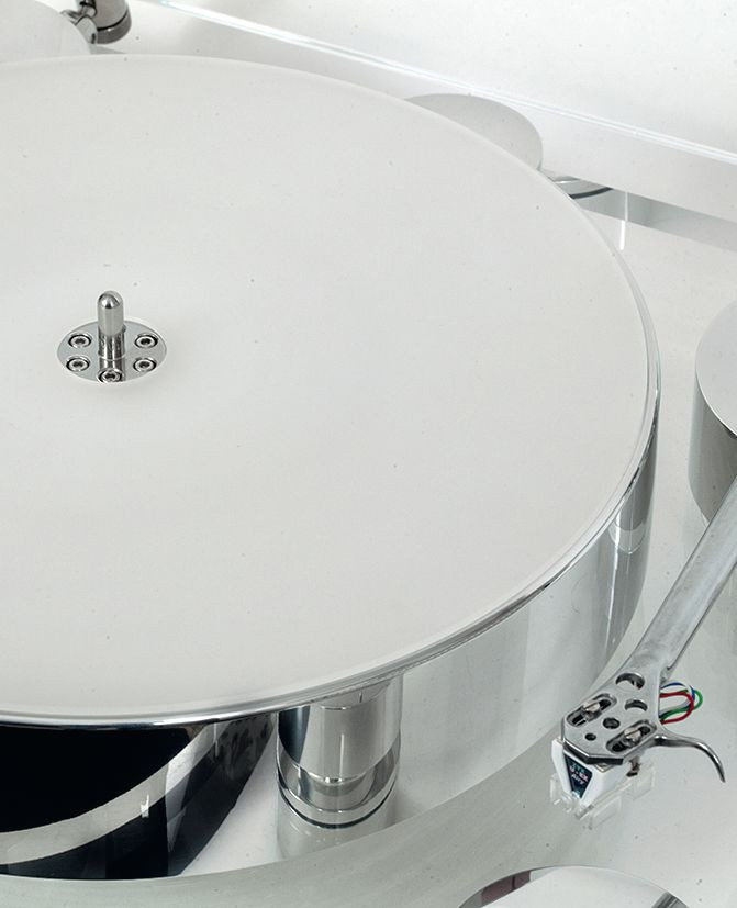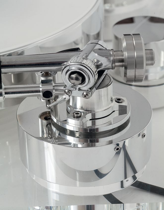 "Krzyżowa" dolna część korpusu prezentuje się dość skromnie na potężnej, walcowej kolumnie wystającej z plinty gramofonu. RB3000 występuje w wersji chromowanej i czarnej, Transrotor wybrał tę pierwszą, współgrającą z metalowymi powierzchniami kolumn.