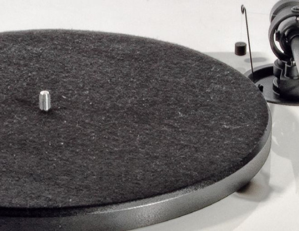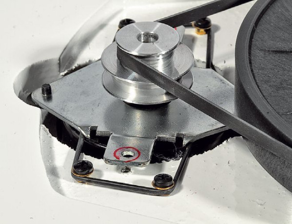 Tutaj, tak jak w niektórych modelach gramofonów Pro-Ject, silnik jest zawieszony na niewielkich paskach z gumy. Moment obrotowy przenoszony jest krótkim, płaskim paskiem z gumy na średniej wielkości (f143 mm) plastikowy sub-talerzyk.