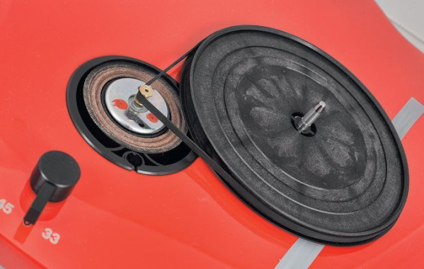 Talerz został wykonany z metalu, który mocno wytłumiono od wewnętrznej strony. Cały mechanizm ukryto pod spodem, silnik został zamontowany w podstawie, musimy tylko założyć płaski pasek napędu.