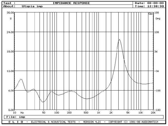 Oczywiście, w ten pełen fanfaronady sposób wchodzimy na temat impedancji. Ale historia jest tym razem wyjątkowo pikantna. Impedancja znamionowa 8Ω. Stoi jak byk na przedostatniej stronie pięknego katalogu, poświęconego wyłącznie Be. Co to znaczy, pryncypialnie rzecz interpretując? Że w całym pasmie wartość modułu impedancji nie powinna spaść poniżej poziomu 6,4Ω, czyli bardziej niż o 20% od zadeklarowanej wartości znamionowej. Mamy jednak zwyczaj warunek ten czynić łagodniejszym, a także bardziej praktycznym, zwiększamy tolerancję do 25%, a jeżeli nawet większe spadki pojawią się w zakresie wysokich tonów, tam gdzie występują już niewielkie moce w typowym sygnale akustycznym, przymykamy na nie oko.