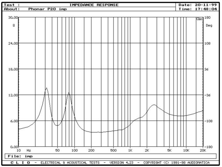 Poziom ok. 3,5Ω w szerokim zakresie 150-700 Hz pozwala zakwalifikować Phonar P20s jako konstrukcję znamionowo 4-omową (rys. 1.); 50Hz (minimum między dwoma wierzchołkami) to uśredniona częstotliwość rezonansowa bassreflexów dwóch podsystemów. Rys. 2. pozwala na dokładniejszą analizę promieniowania źródeł niskich częstotliwości. Głośnik i komora dolna zostały dostrojone niżej, minimum amplitudy głośnika przypada na 45Hz, niewiele wyżej widać maksimum ciśnienia otworu, pracującego bardzo efektywnie.