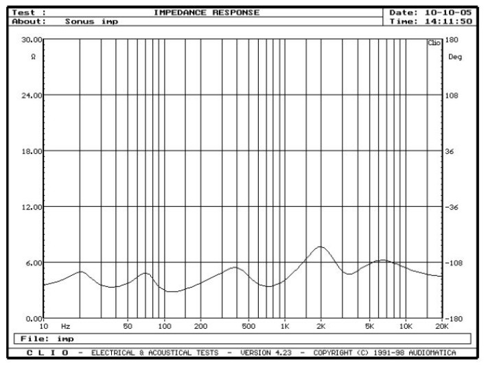 Pierwszy rzut oka na rys. 1, i wiadomo, że będzie o czym napisać. Konstruktor najwyraźniej przeprowadził linearyzację charakterystyki impedancji, co po pierwsze jest rzadko spotykane, po drugie chyba po raz pierwszy w zespole głośnikowym Sonusa, po trzecie zamiar ten przeprowadzono bardzo konsekwentnie w całym pasmie - nie ograniczono się do zakresu średnio-wysokotonowego, ale elektrycznemu wytłumieniu poddano również wierzchołki w zakresie niskotonowym, a to już naprawdę rzadki ptak, bo wymaga zastosowania w zwrotnicy obwodów z elementami o dużych wartościach.