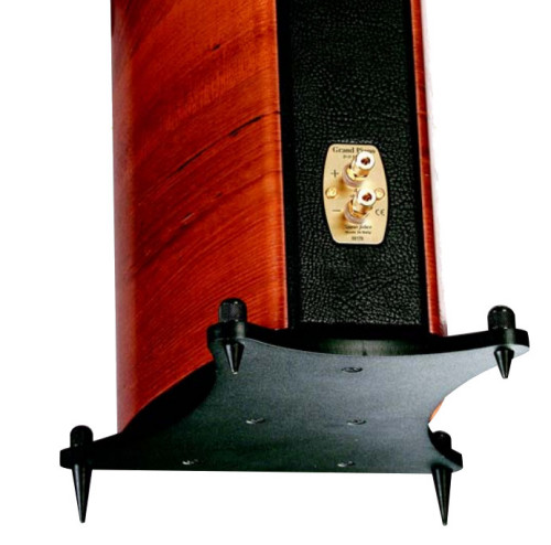 Podobny zabieg wykonano w B&W 804S, ale kto kogo będzie w tej sprawie ciągał po sądach, jeszcze nie wiadomo. Front, wąski panel tylny, a także ściankę górną, pokryto czarną skórą. Jak dobrze widać ma zdjęciach, Grand Piano mają sylwetkę lekko pochyloną do tyłu. Nie jest to jednak cecha samej bryły kolumny, ale wpływu na nią cokołu. Metalowa płyta jest uzbrojona w cztery kolce, z których dwa przednie mają 4- cm długości, a tylne tylko 1,5-cm.