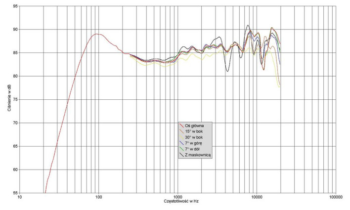 W zakresie średnio-wysokotonowym charakterystyka wykazuje lekką tendencję wznoszącą, poziom powyżej 1 kHz jest średnio o 3 dB wyższy niż w zakresie 300 Hz - 1 kHz. Dlatego również pod dużym kątem 30° górna część pasma ma wciąż na tyle wysoki poziom (i do tego wydaje się najlepiej wyrównana), że i w takiej pozycji XQ10 mogą grać dobrze - a może nawet najlepiej. Wyjątkowa zbieżność charakterystyk dla pozostałych osi i brak osłabienia w okolicach częstotliwości podziału wynika z działania koncentrycznego układu przetworników.