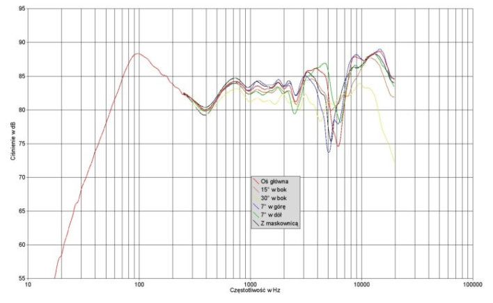 Co do ustawienia głośników, to trudno o jednoznaczne wskazówki, większość charakterystyk mierzonych pod różnymi kątami (jak i z maskownicą na osi głównej) leży blisko siebie, dopiero pomiar pod kątem 30° pokazuje spodziewane wyraźne obniżenie poziomu wysokich częstotliwości (ale osłabienie przy 5-6 kHz jest znacznie płytsze).