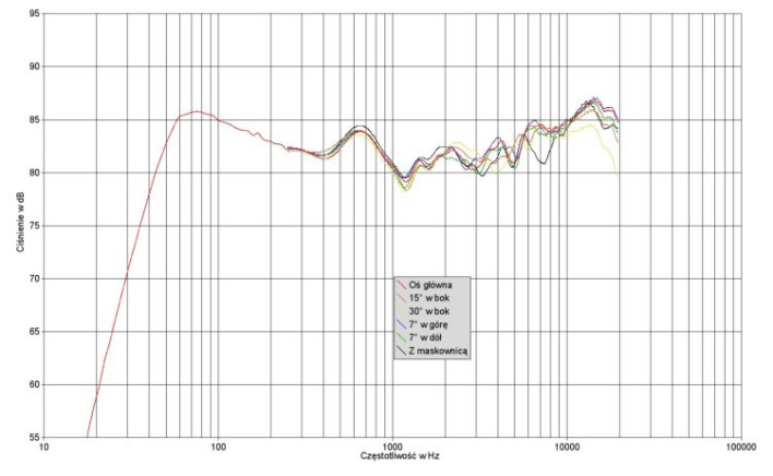 Zbieżność krzywych zdjętych na różnych osiach, wraz z charakterystyką zmierzoną z maskownicą jest bardzo dobra, komentowanie drugorzędnych cech każdej z nich nie ma sensu, oczywiście na osi 30° obniżenie jest relatywnie największe, ale niewielkie różnice w wysokości podstawek czy pozycji słuchacza nie będą miały poważnego znaczenia dla brzmienia.