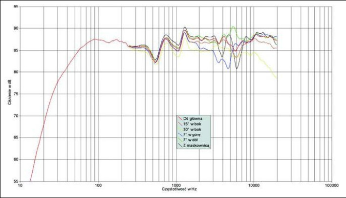 W zakresie średnio-wysokotonowym widać szereg lokalnych nierównomierności, ale nie determinują one jakiejś poważnej tendencji. Na osi 7O w dół mamy mały "pik" przy 5,5 kHz, a 7O w górę osłabienie w zakresie kilku kHz. Maskownica wywołuje dwie zapadłości - przy 4 i 6 kHz. Ze względu na lekką przewagę górnej części pasma nad dolną, warto zejść w bok z osi głównej na oś 15° lub nawet trochę więcej, spróbować więc ustawienia kolumn z osiami głównymi mniej-więcej równoległymi, biegną- cymi po bokach miejsca odsłuchowego.
