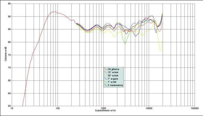 Wysokie tony też są wzmocnione, ale już delikatniej, średnio o 3 dB. Na osi 7O w dół pojawia się osłabienie przy 3 kHz, na osi 7O w górę nie dzieje się nic niepokojącego, sytuacja jest bardzo podobna do obserwowanej na osi głównej; również pod kątem 15O w płaszczyźnie poziomej charakterystyka jest dobrze wyrównana. Również maskownica nie wywołuje bardzo poważnych niepokojów - widać dołek przy 5 kHz, ale nie jest on głęboki.