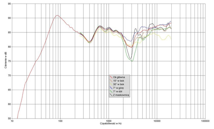 Mimo tak niskiego strojenia, charakterystyka przetwarzania nie jest imponująco rozciągnięta - ma wysoki szczyt przy 80-90 Hz, ale poniżej opada już szybko, punkt -6 dB (względem poziomu średniego z całego pasma) leży przy 45 Hz. W zakresie średnio-wysokotonowym widać osłabione okolice 400 Hz i 3 kHz, w drugim przypadku jest to prawdopodobnie związane z niedoskonałą integracją obydwu przetworników w zakresie częstotliwości podziału. Osłabienie to jest najmniejsze pod kątem +7° - zgodnie z wyjaśnieniami producenta, że L-3 są dostrojone tak, aby kierować najlepszą charakterystykę lekko w górę. Na osi 30° w bok zakres wysokich częstotliwości leży nieco zbyt nisko, ale pod kątem 15° sytuacja jest bardzo podobna, jak na osi głównej. Maskownica pogłębia dołek przy 3 kHz i wprowadza lżejsze nierównomierności w zakresie wysokich tonów.