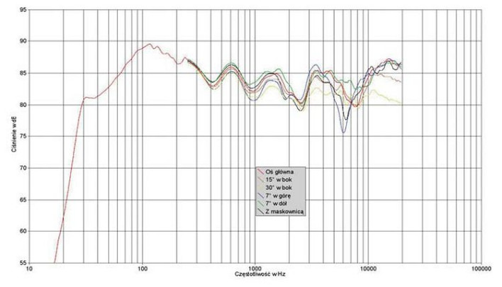 Częstotliwość podziału jest więc wysoka (producent podaje 4 kHz, ale w naszych pomiarach "wychodzi" jeszcze wyżej), co raczej nie służy dobrym charakterystykom w płaszczyźnie pionowej, te są jednak i tak nie najgorsze dzięki ustawieniu tweetera blisko głośnika niskośredniotonowego. Osłabienie jest największe na osi skierowanej 7° w górę a najmniejsze 7° w dół, najlepiej więc usiąść w głębokim fotelu.