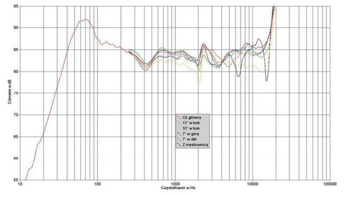 Zakres średniotonowy i dolny podzakres wysokotonowego prezentuje dobrze, choć nie idealnie wyrównany przebieg, w którym nie zostaje wyraźnie wyróżniona żadna oś poza osią 30°, co oznacza stabilność brzmienia niezależnie od tego, czy siedzimy nisko czy wysoko. Maskownica odznacza się dwoma zapadłościami - przy 6,5 kHz i 15 kHz.
