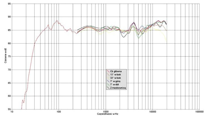 W dodatku charakterystyki z różnych osi leżą bardzo blisko siebie, a pod kątem 30°, zwykle najbardziej upośledzającym przebieg, znika nawet jedyny mały mankament, widoczny pod mniejszymi kątami - górka przy 4 kHz. Bas nie został wyraźnie uwypuklony w średnim podzakresie, co jest w zasadzie stałą praktyką dla dużych kolumn, ma za to świetne rozciągnięcie - spadek -6 dB pojawia się przy 30 Hz. A skoro tak, to producent obiecuje pasmo od 18 Hz...