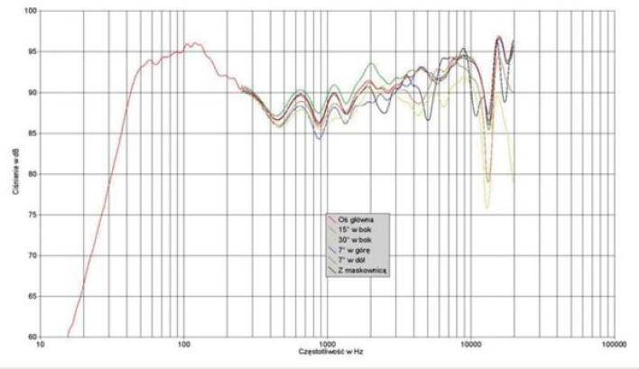 Charakterystyka przetwarzania pokazuje wyeksponowany, jak też ładnie rozciągnięty zakres niskich tonów i obficie pofalowany zakres średniowysokotonowy, z wyraźną tendencją do wznoszenia się w kierunku górnego skraju pasma. Na osi +7O zakres średnich tonów jest najbardziej wycofany, na osi -7O (kiedy usiądziemy nisko) najbliższy poziomowi wysokich tonów. Maskownica nie wygładza charakterystyki, tak jak można by się spodziewać na podstawie specyficznej konstrukcji frontu, nawet wprowadza kilka dołków, jednak i bez niej ich nie brakuje, więc po prostu nie trzeba się nią przejmować. A teraz sensacja: efektywność napięciowa wynosi aż 92 dB - to rekordowy wynik, co prawda po części wynikający z niskiej impedancji, ale mimo to - super.