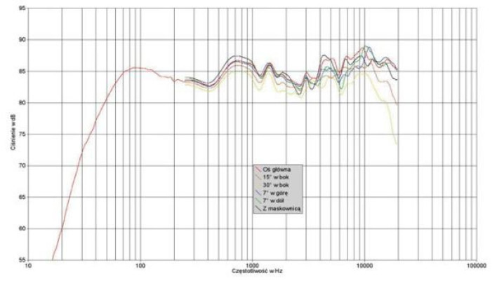 Choć pofalowana, jest ona nieźle zrównoważona, ale na tle większości konstrukcji zwraca uwagę dość niski poziom w zakresie basu. Nie będzie się to wydawać dziwne, gdy weźmiemy pod uwagę 8-omową impedancję. Kształt charakterystyki wynika więc z tego, że konstruktor strojący zwrotnicę pozwolił średnim i wysokim tonom na osiągnięcie nieco wyższego pułapu. Charakterystyczny dla 28-mm kopułek starszego typu jest łagodny spadek już od 10 kHz wzwyż; nie doświadczamy tego w Dynaudio X16, gdzie zastosowano nowsze, bardziej usztywniające kopułki, mniej tłumiące nasączanie. Tak jak we wszystkich monitorach tego testu, zbieżność charakterystyk zdjętych na różnych osiach jest bardzo dobra. Jak już wspomniałem w głównej części opisu, pomiary w naszym laboratorium nie ujawniają działania "Bias Technology", bowiem rozwiązanie to dotyczy zjawisk w innym obszarze, nie objętym naszymi "metodami badawczymi". I chociaż próbowaliśmy (dokonaliśmy niezależnych pomiarów z układem włączonym i wyłączonym), to nasze laboratorium ani nie potwierdza, ani nie zaprzecza...