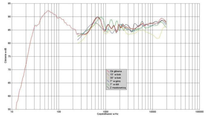 Charakterystyka przetwarzania ma trzy etapy: wzmocnienie w obszarze niskich częstotliwości, osłabienie okolic kilkuset herców i dobre wyrównanie zakresu średniowysokotonowego z minimalnym wzrostem w stronę częstotliwości wysokich. Charakterystyki z różnych osi leżą bardzo blisko siebie, także w zakresie najwyższych częstotliwości, tylko pod kątem 30° poziom jest zauważalnie niższy. Bardzo korzystne jest uniezależnienie charakterystyki od wysokości osi pomiaru (oczywiście w rozpatrywanym niewielkim kącie +/-7°), druga częstotliwość podziału nie daje się sprowokować i nie ujawnia się zapadłością na żadnej osi. Maskownica także ma praktycznie pomijalny wpływ. Wróćmy jeszcze na chwilę do niskich częstotliwości - spadek ?6 dB względem średniego poziomu, ustalonego jako 87 dB, to bardzo niskie 28 Hz, odliczając od wierzchołka przy 60 Hz byłoby to 30 Hz.