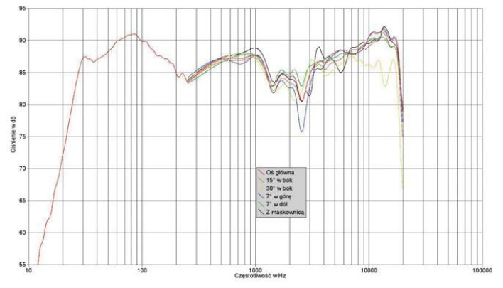 Nie mniejszym jest fakt, że charakterystyki zmierzone pod różnymi kątami są bardzo bliskie charakterystyce z osi głównej - typowe dla tuby skupianie wiązki nie ma tu miejsca, sposób rozpraszania przypomina najlepsze kopułki i wstążkę z PL300. Zadziwiające! Wąskopasmowa zapadłość przy 2,5 kHz (taka jest więc naprawdę druga częstotliwość podziału) pojawia się pod kątem +7° w płaszczyźnie pionowej, ale tym razem oś główna została ustalona dość wysoko - na poziomie 1 metra; z kolei pod kątem -7&3176, na jakim znajdą się słuchacze siedzący nisko (np. na wysokości 70 cm wodległości 3 metrów) osłabienie w zakresie 1,5 kHz - 3 kHz jest już bardzo niewielkie.