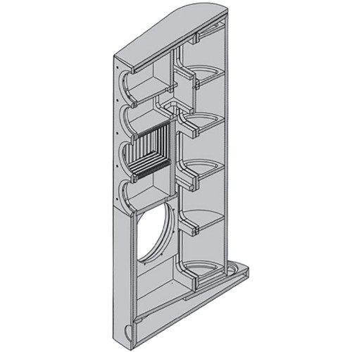 Tak wygląda obudowa Cardeasa - w wersji Plus pojawiają się jeszcze dwa tunele bas-refleks wychodzące dołem, tam gdzie widać ćwierćkoliste wycięcie w najniżej położonym wieńcu wzmacniającym, z tyłu obudowy.