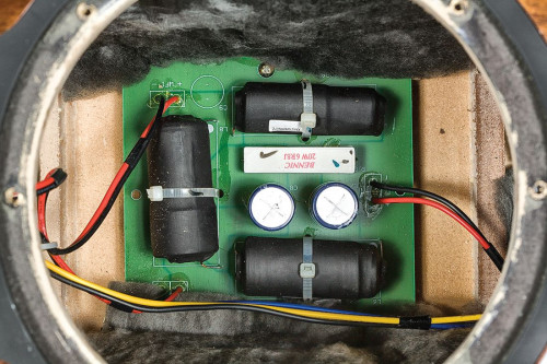 Zwrotnicę podzielono między dwie płytki. Na jednej (lewa) umieszczono filtr sekcji niskotonowej. Jak widać - dość skomplikowanej, skoro znajdują się w niej aż trzy cewki (rdzeniowe), dwa kondensatory (elektrolityczne) i jeden rezystor (ceramiczny). Podręcznikowy dolnoprzepustowy filtr 3. rzędu zawiera dwie cewki i kondensator. Prawdopodobnie taki filtr uzupełniono równoległym obwodem RLC, częściowo linearyzującym impedancję (w zakresie "górnego" wierzchołka bas-refleksowego, przy 40 Hz, na co wskazują pomiary - jest wyraźnie spłaszczony). Zastanawiające jest jednak wyprowadzenie kabli do obydwu niskotonowych z oddalonych miejsc (po lewej stronie płytki) - a przecież są podłączone do tego samego filtra. Ponadto kabel doprowadzający sygnał do filtra (po prawej stronie płytki) jest tylko dwużyłowy, więc regulacja poziomu jest prowadzona poza tą płytką.