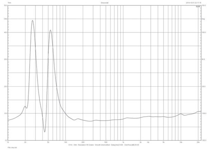 W zakresie niskich tonów charakterystyka odzyskuje wysoki poziom, głównie dzięki bardzo efektywnemu działaniu bas-refleksu. Dostrojony do 43 Hz, promieniuje przy tej częstotliwości bardzo "ostro", co wiąże się z kolejnym fenomenem - spadkiem impedancji przy częstotliwości rezonansowej znacznie poniżej wartości rezystancji cewki; ta wynosi 6,5 oma lub 7,3 oma (w danych producenta spotkałem się z różnymi wartościami), w każdym razie mamy do czynienia z głośnikiem nominalnie 8-omowym, ale minimum przy 43 Hz ma wartość ok. 3,5 oma.