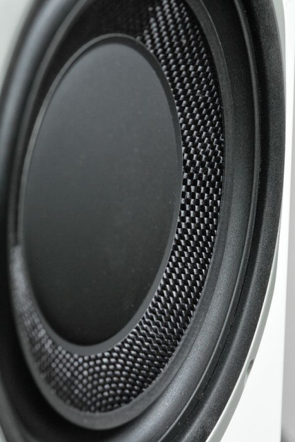 Głośniki niskotonowe mają już membrany dwuwarstwowe, złożone z widocznej z zewnątrz plecionki z włókna szklanego, i znajdującej się po "lewej" stronie warstwy celulozowej. Membranę wzmacnia dodatkowo bardzo duża nakładka przeciwpyłowa, oczywiście zwiększająca też masę, ale w głośniku niskotonowym niska masa drgająca wcale nie jest priorytetem - ważne jest, aby przy optymalnej masie uzyskać jak największą sztywność i przynajmniej dobrą stratność wewnętrzną.