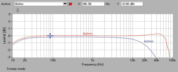 Układem korekcji LAPC (korekcja dokonywana niezależnie dla każdego obciążenia) spowodował korektę przede wszystkim charakterystyki przenoszenia, pozostałe parametry zmieniły się albo w stopniu śladowym, albo w ogóle. Na rys.1b mamy więc charakterystyki przenoszenia z włączonym systemem LAPC, dla obydwu obciążeń nie widać żadnych wzbudzeń, spadek -3 dB dla 8 omów pojawia się przy 51 kHz, a dla 4 omów – przy 36 kHz.