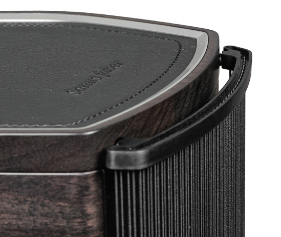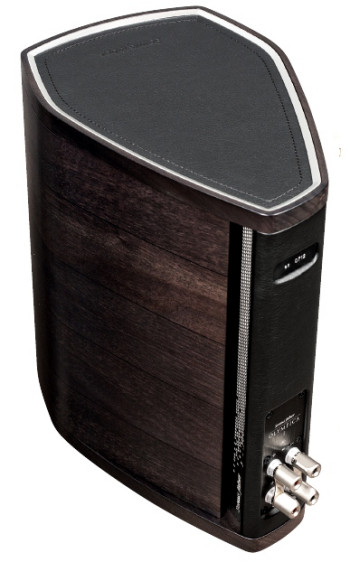 Zewnętrzne powierzchnie obudowy - nie licząc elementów metalowych i plastikowej, czarnej osłony, która dyskretnie zasłania kosze głośników - wykończone są skórą (ścianki górna, dolna, przednia i tylna) i naturalną okleiną orzechową - na ściankach bocznych.