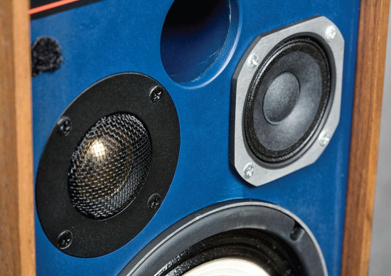 No i też nieprzypadkowo niebieski ("monitor blue") front i maskownica. Do tego już mniej charakterystyczne dla JBL-a, chociaż starożytne, mocowanie maskownicy na rzepy, wciskanie maskownicy między wystające fragmenty ścianek bocznych, dolnych i górnej ("w ramkę"), no i dwa regulatory - poziomu tonów średnich i wysokich - na wyodrębnionym paneliku.